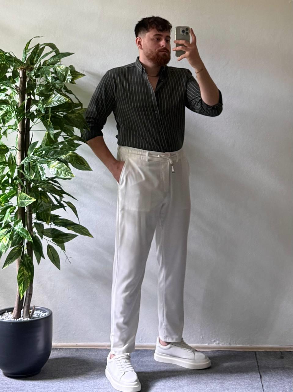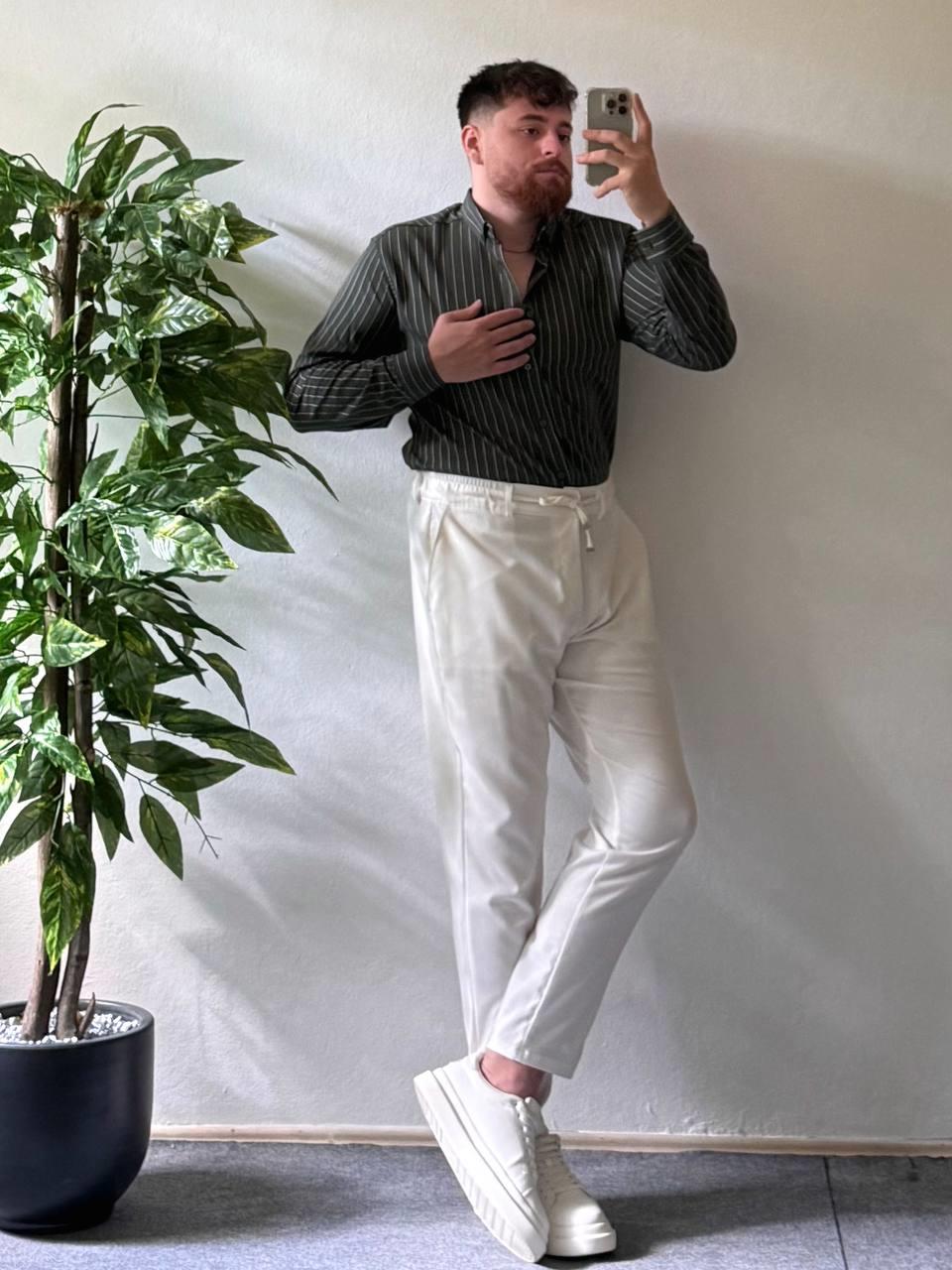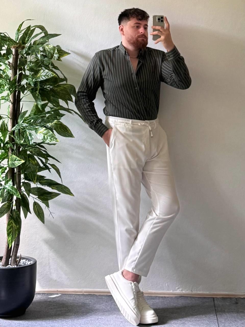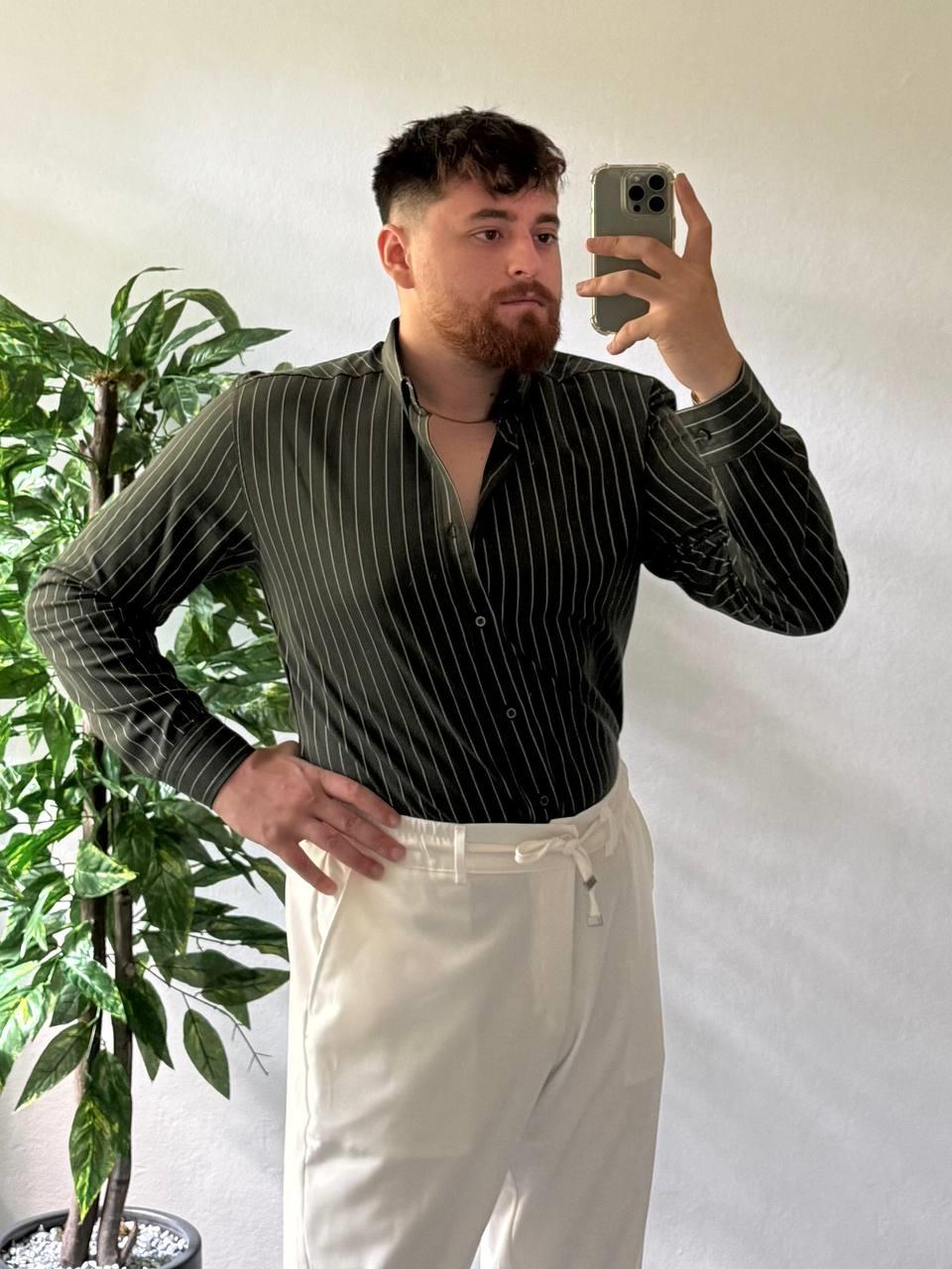 Haki Beyaz Çizgili Modal Kumaş Gömlek